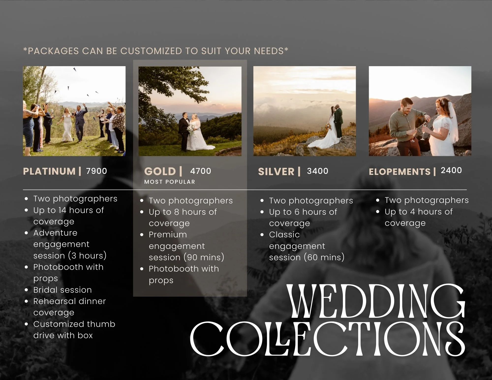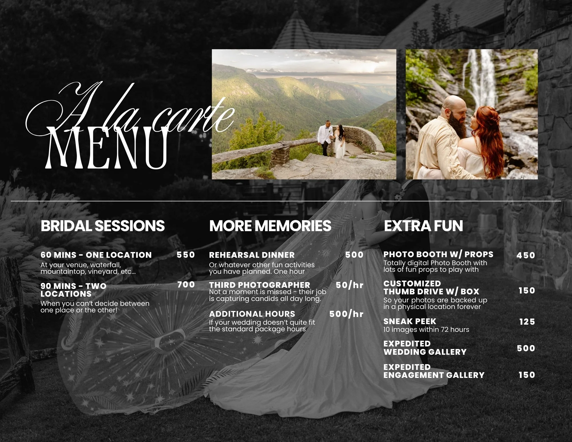 We are based in Sylva, NC. Our travel rates vary depending on the distance from home base. If your wedding falls within a 2.5 hour radius of Whittier, there are no travel fees. The rates for further travel are as follows-